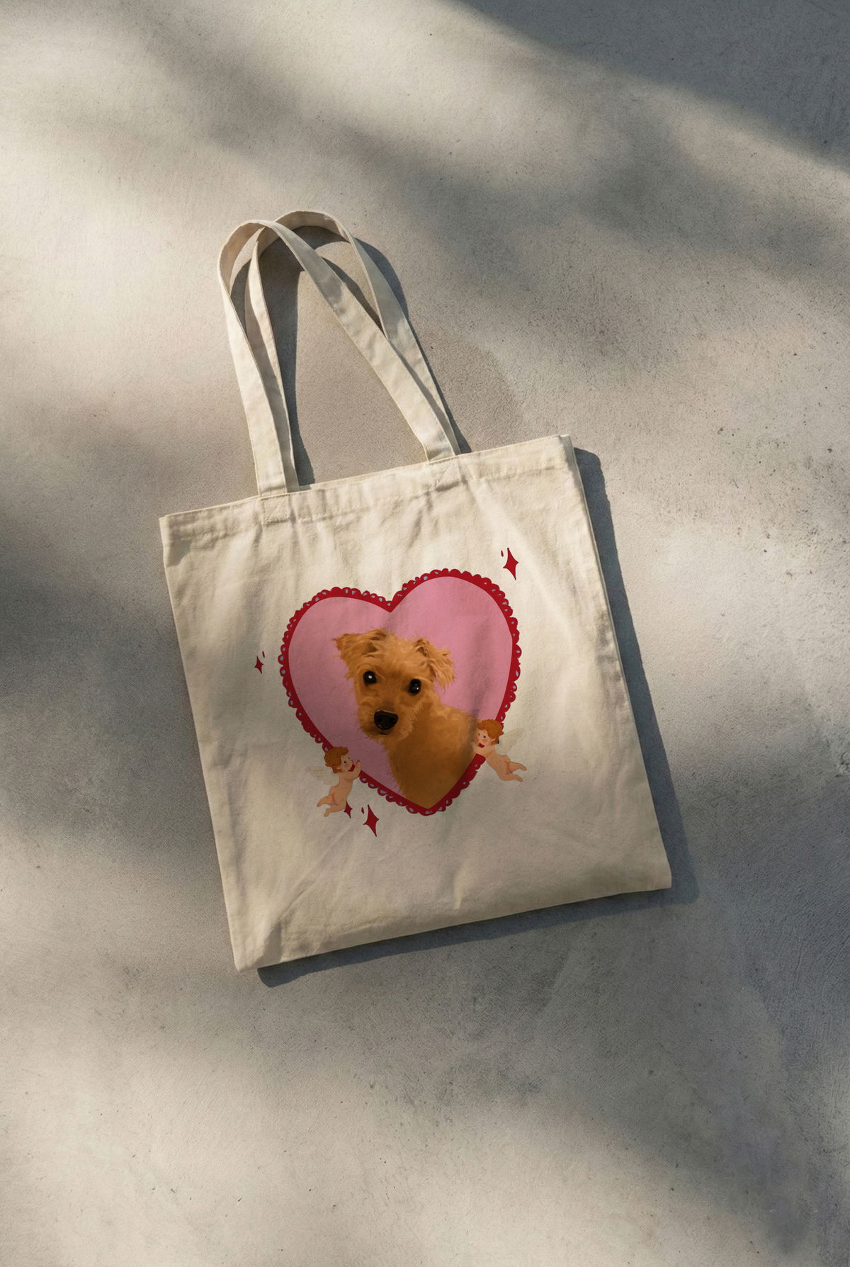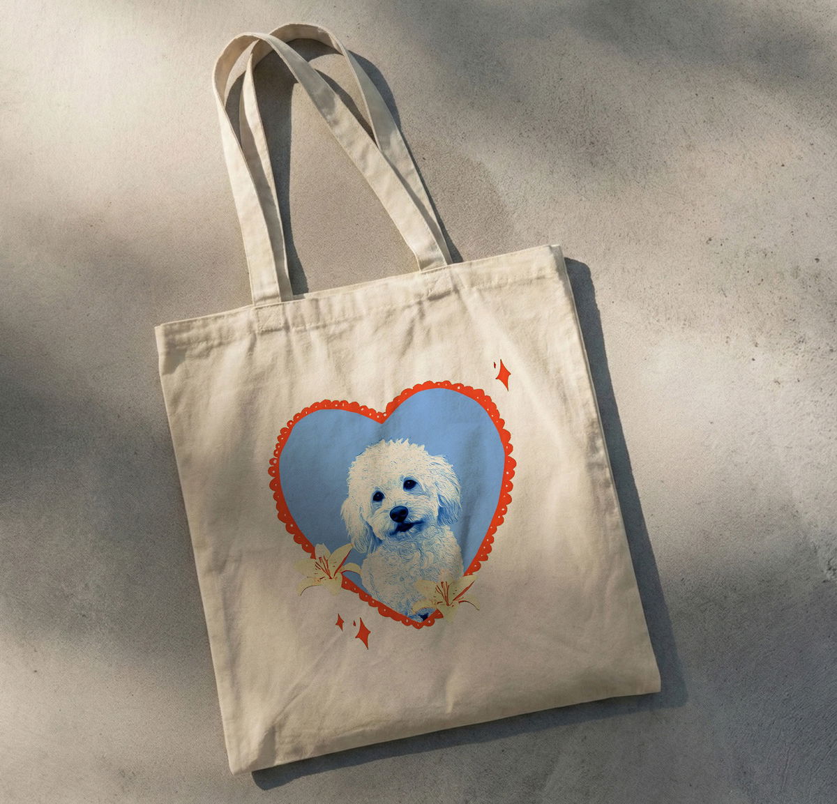 Tote bag personalizada con imagen de tu mascota. Realizadas en lienzo beige. 30x40 cm. Luego del pago, nos comunicamos por WhatsApp para que envíes la foto de tu mascota y armamos el diseño: puede ser como los ejemplos o con una idea propia. 10 días de demora.